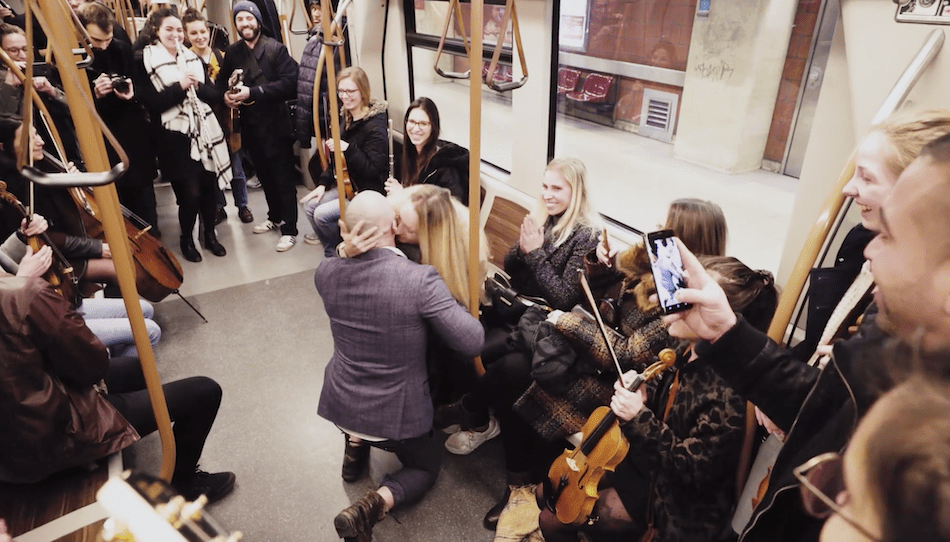 Yes, it happened this weekend! Marriage proposal, accompanied by live music took place on the Brussels metro. Musevent, a group of musicians who play music at events posted a video on their facebook page, showing what actually happened.