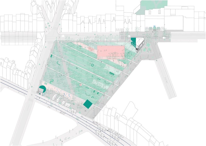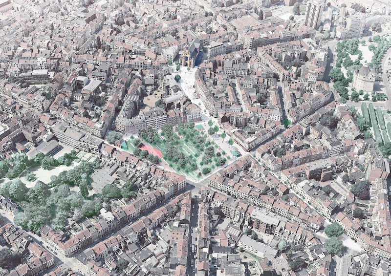 Their project resolutely opts for a very natural space, with a softened soil on many places and more trees. They also took into account the many possible activities on the square. For example, people will be able to play several sports and a secured bicycle parking will be installed next to the small corner building at Rue de la Victoire. Close to Parvis, a canopy ensures that activities can take place even when it rains. Furthermore, the weekly market can be organised conveniently on the lower part of the park, in the extension of Parvis, which will be stretched along Rue Jourdan.