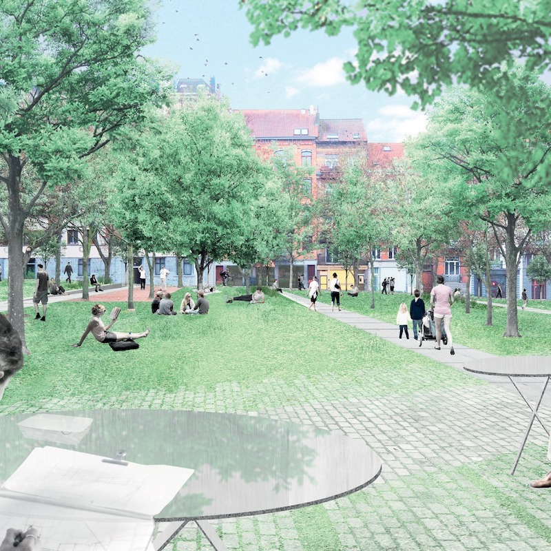 Thanks to the combination of urban functions with trees and bushes, Place Marie Janson will feel both like a park and an urban square. This “urban park” will be connected with its counterpart, the stately Parvis de Saint-Gilles. By substantially restricting car traffic in Rue Jourdan and Rue de Moscou, both streets will become pleasant walking and cycling routes and will become part of park. Furthermore, in Rue de l’Hôtel des Monnaies, at the upper side of the park, cyclists and pedestrians will be able to cross safely to Pierre Paulus Park (“duckling park”) thanks to a platform. This creates a soft connection between upper and lower Saint-Gilles (Place Morichar > Paulus park > Place Marie Janson > Parvis).