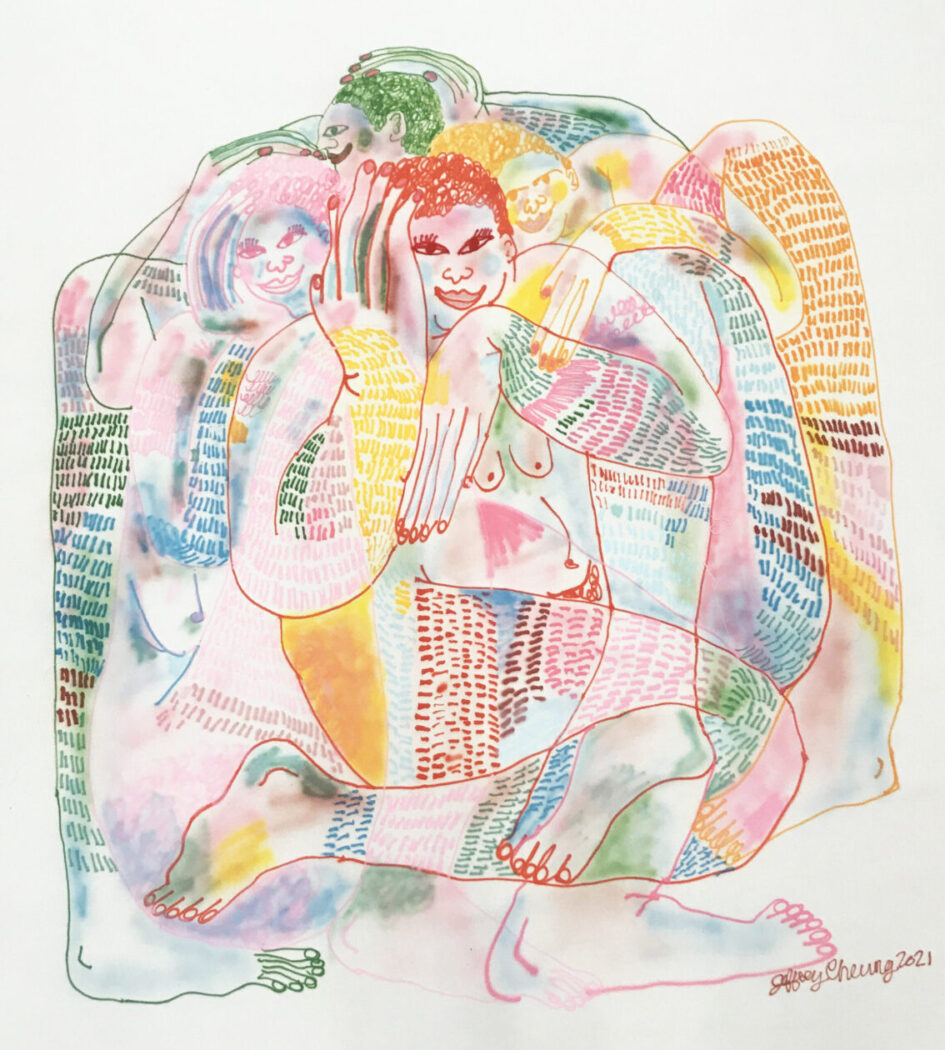 Even though we’re talking about an art exhibition, it is reductive to define Jeffrey simply as an artist. In addition to being a painter, he is a skateboarder, a musician and a social activist. Themes of queer love are prevalent in his paintings, characterized by intertwining bodies of various skin colours and brightly painted backgrounds. The Chinese-American artist’s goal is to celebrate queer identities and sexualities by presenting positive images of queerness. Moreover, Jeffrey refuses to limit the colour palette of the bodies to pink and peach, seen as strictly connected to whiteness. By depicting individuals of different skin tones embracing each other, he celebrates bodies of all kinds and colours.