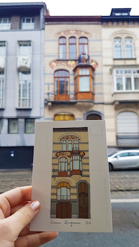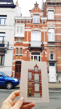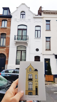 We really love the sets of postcards based on Brussels houses: what is your creative process? Do you take a picture of a house you like and then draw it at home or do you work “en plein air”?