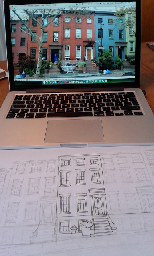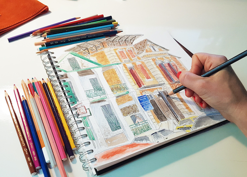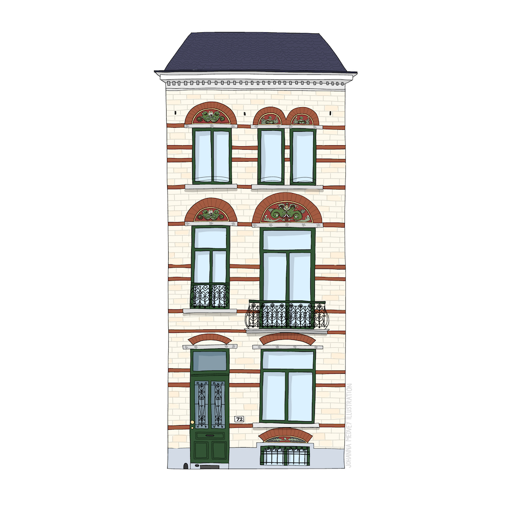 I start by putting pictures of the building in front of me and I sketching on my tablet. Then I draw the contours of the house in a very clean way, I colour it in and I add all the little details and nuances that make the final drawing come more “alive”. I like to think of the coloring-in process as doing a mandala. Some people buy colouring books and spend hours on them to relax. I am lucky to colour my own drawings and to get in a complete “flow experience” on a regular basis. I love it!