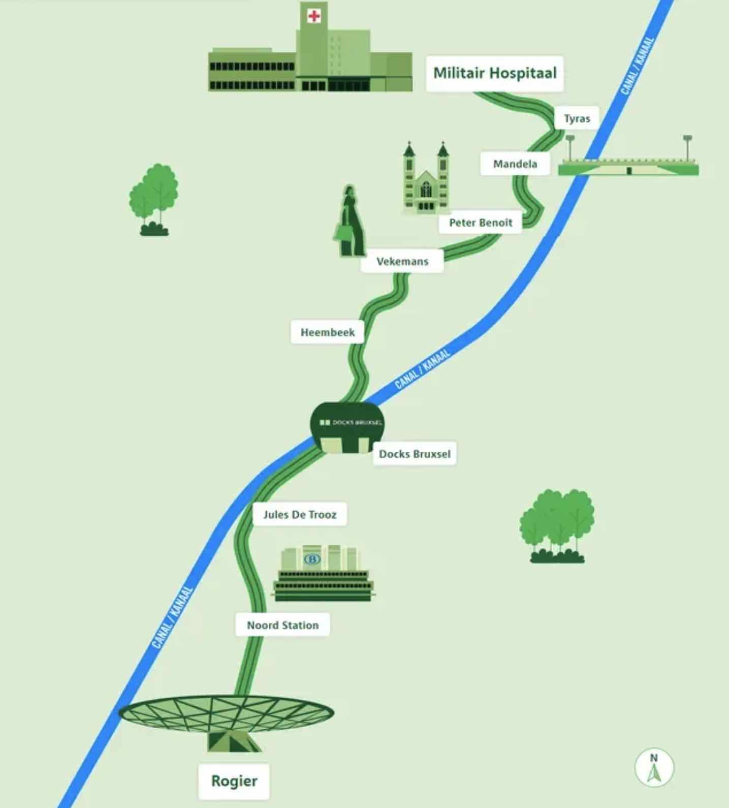 With the stops Heembeek (Avenue des Croix du Feu), Ancre (Rue de Heembeek), Zavelput (Rue François Vekemans), Peter Benoit (Place Peter Benoit), Chemin Vert (Chemin Vert), Mandela (Chemin Vert), Trassersweg (Rue de Ransbeek), Van Oss (Rue de Ransbeek), Mercator (Avenue de Tyras) and Hôpital Militaire (Rue Bruyn), a total of 10 tram stops will be added in Neder-Over-Heembeek over a route of about 5km. This tram line construction is part of the Brussels Region’s wider mobility ambitions, formulated in Good Move, to offer Brusselers and visitors even more efficient public transport and convince more people to make the modal shift.