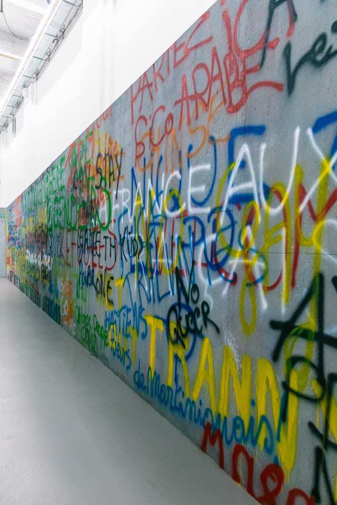 The exhibition continues through the site-specific installation The Walls Remember, Archives of Insults. Walls of a bunker displaying a collection of graffiti with misogynistic, homophobic, and racist insults and slurs that accompany the urban landscape experience of marginalized groups. The installation reminded me, by contrast, of the militant work of a collective based in Brussels, Collage Feministes which uses the walls of the city to react to the pervasive and systemic verbal violence of the society, reclaiming their own voice in the urban landscape. We can see these two different approaches, to a certain extent, as complementary. Mehdi-Georges Lahlou’s collection aims to defuse the violent scope of those insults and at the same time keeps their harsh memory alive, Collage Feminists, instead, reacts and put in place a strategy of verbal and visual resistance.
