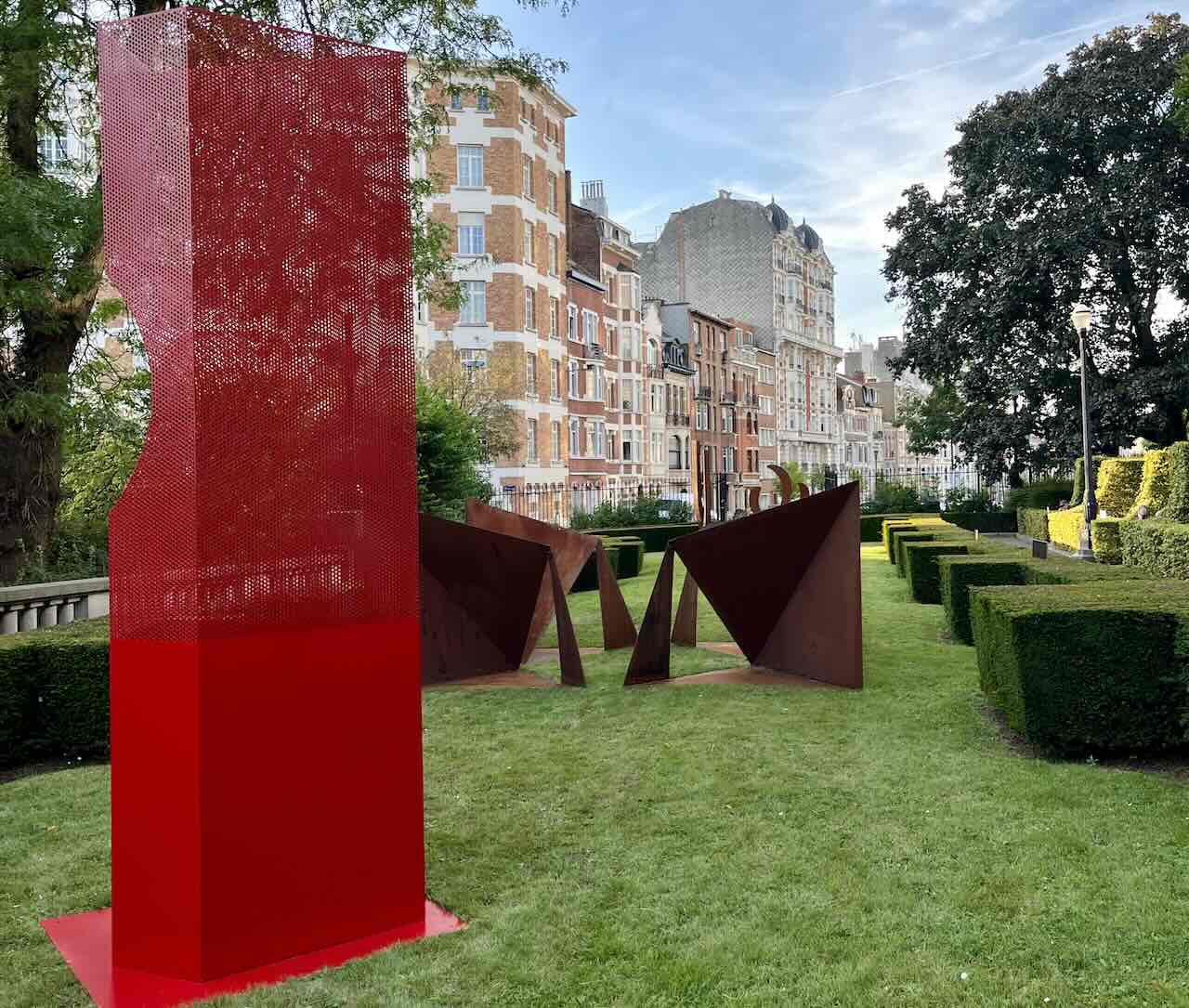The series concludes, or rather begins anew, with Chambre Sensorielle, colonne rouge (Jean-Bernard Métais, represented this year by Galerie La Forest Divonne). Captivated by this creation, we draw closer, step back, and circle around it to fully absorb its essence. In this interaction, the sculpture seems to move with us. The moiré technique (perforation) generates optical illusions and visual distortions that we experience as we engage with the work. Perfectly in tune with its surroundings, the sculpture provides a dual experience of observation: first, we admire it, and then we look through it. A line of ascending energy unfolds from left to right, enhanced by the sculptures that line the garden. We catch sight of a Kouros bust (Louis), remarkable for its lightness, accentuated by the horizontal cuts that run through it. In the darker corner of the garden, we glimpse Vitre sur un monde clos (Richard & Zéno Flament), crafted for “the shade of the great trees of Square Steurs”. “A transparent human presence… It illustrates that a light emerging from darkness casts no shadow…” (Zéno Flament).