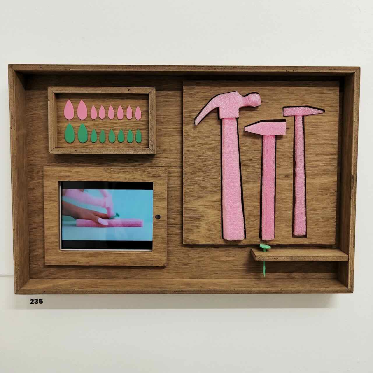 The exhibition has been conceived as a cabinet of curiosities in which all the works are displayed together without a specific criterion, not of media nor thematical; the works are simply juxtaposed on the walls and on the structures created for the occasion, “it might give the sensation of an Instagram feed” as one of the participating artists pointed out. On the one hand this horror vacui might result in a certain difficulty in the readability of the works, as some of them might cannibalize the others, monopolizing the eye of the visitor, causing a certain visual fatigue, although an unusual and fruitful association of artworks might stem from such a heteroclite display; as another artist pointed out, it was a good occasion to stir things up, as artists of the same medium tend to work and often be exhibited together. On the other hand, the soft curatorial approach might set the visitor free to create their own meaning path, without an excessively constrictive framework to follow, as part of the stated intention of attracting new audiences that see the contemporary art world as too distant and somehow rejective.