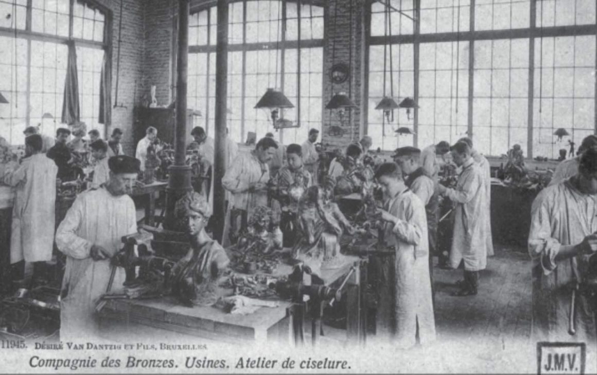 Started as a family business, the future Compagnie des Bronzes was founded in 1854 nearby the cathedral, for the “confection and sale of items made of zinc, copper iron and other metals”; soon the production was extended to decorative objects and furniture and most importantly, to the monumental bronzes coming from public commissions which made it necessary to move the production to the Molenbeek location. Public commissions which objective was to celebrate the heritage of the newly independent regions, to enlighten citizens, pedestrians, and the broader public regarding the legendary or actual contributions of historical and modern personalities, and to adorn public spaces. Among the most distinguished Belgian sculptors of the century participated in illustrating the city such as public: Paul De Vigne, Julien Dillens, Guillaume Geefs, Jef Lambeaux, Eugène Simonis, Thomas Vinçotte, among them an emerging Auguste Rodin.